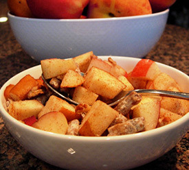 - Mix the nectarine, pear, pecans, and dates in a medium sized bowl. Sprinkle with cinnamon and mix until well coated.