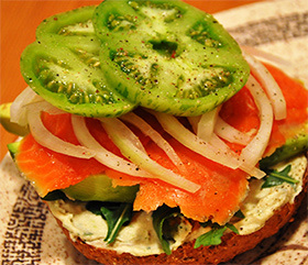 - Spread each piece of the bun with 1 Tablespoon of hummus. Top each with half the arugula, avocado, salmon, onions, and tomato.