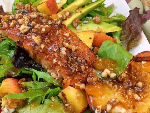 This recipe makes a perfect flat-abs meal. Fresh greens, grilled peaches and tender salmon make a mouthwatering combination. Enjoy for lunch or dinner.