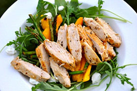 This recipe takes the concept of chicken salad to a whole new level. There is so much going on in the flavor department like sweet mango, savory chicken, tender asparagus, tangy arugula, and creamy goat cheese. Servings: 4