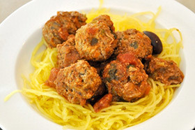 - Place a scoop of spaghetti squash noodles on each plate, top with meatballs and some sauce and then throw on a few olives.