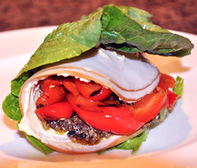 - Lay the lettuce leaf flat and spread with 1 tablespoon of hummus. Place the turkey slices on the lettuce and spread with remaining hummus. Sprinkle the olive tapenade over the turkey and top with the roasted bell pepper.