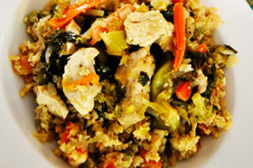 Resist the temptation to eat out by making quick, healthy dinners like this one. Chicken and veggies make up the bulk of this meal, keeping you lean and green. Instead of rice, serve this stir fry over a cauliflower rice. To make simply run a head of cauliflower through a food processor with the grating attachment, so that it is finely shredded. Sauté the cauliflower in a large skillet, with a teaspoon of olive oil, until soft. Season with salt and pepper. Serving: 6