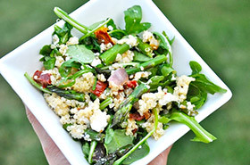 - In a large salad bowl, combine the arugula, quinoa, warm veggies and sprinkle with the goat cheese.