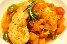 - Add the vegetables to the skillet and maintain the heat on medium. Cook, stirring often, until the onion is translucent. Sprinkle in the flour and paprika and stir well. Bring to a boil and cook until the tomatoes give off their juices, about 10 minutes. Pour the veggies over the chicken and cover.