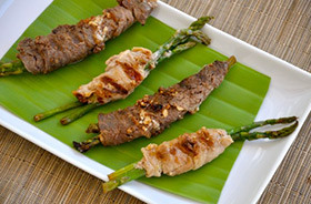 This recipe for Teriyaki Rib Eye and Chicken Wrapped Asparagus is savory and delicious. It’s a wonderful way to get your protein and veggies all at once! Fight the urge to serve this meal with traditional rice, and instead shred a head of cauliflower in a food processor and sauté into low-carb, guilt-free rice. Enjoy!
