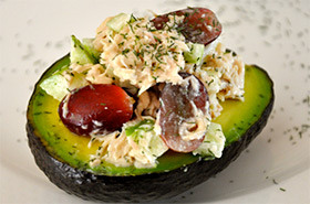 - Serve by placing a scoop of tuna into each avocado half. Sprinkle with dill weed.